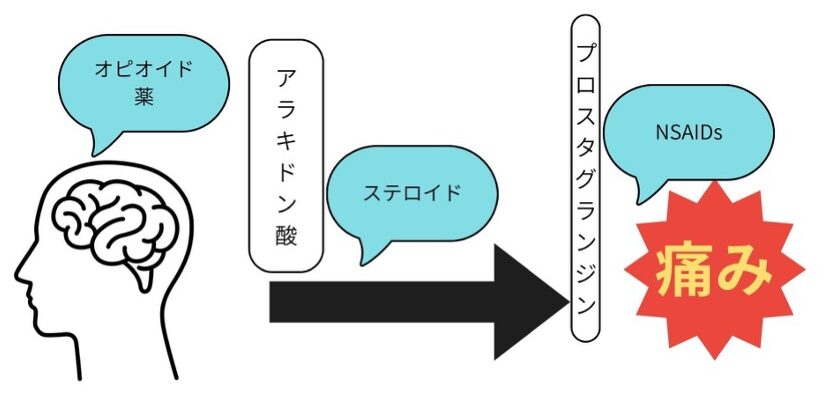 NSAIDsがプロスタグランジンの産生を抑えるのに対して、ステロイドはその前段階であるアラキドン酸という炎症や痛みのもととなる物質の働きを抑えます。