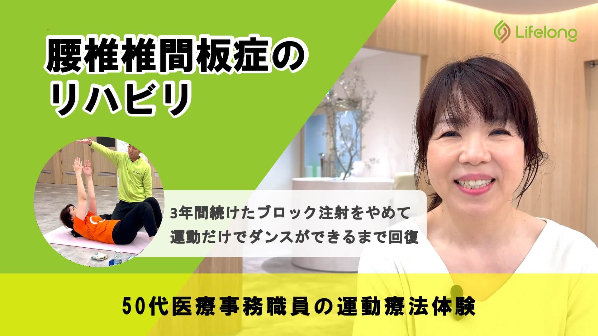 Sさんは椎間板症による腰痛でペインクリニックに3年間通いましたが、大きな改善は見られませんでした。デスクワーク中に強い痛みを感じ、後ろを振り向くことができませんでした。痛みのある腰は非常に硬くなり、腹筋も機能していなかったので、痛みのない範囲で腹筋強化と腰部の可動域を増やしていきました。長引く腰痛のためすぐには効果を実感できませんでしたが、少しずつ痛みが軽減していき、今ではダンスを趣味に楽しめるまで回復されました。